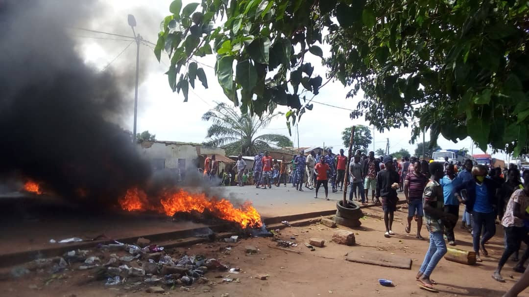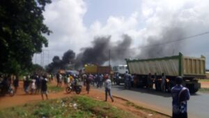 ©Newsoftogo-(Lomé, le 28 juillet 2020)-La nationale n°1 a été bloquée ce lundi 27 juillet 2020 et ce, pendant des heures par des jeunes de Kpali et de Dévé, deux (2) quartiers voisins de Tsévié (35 km au nord de Lomé) avec des pneus brûlés et des barricades. Une situation née de la course poursuite entre les agents de l’opération entonnoir et vendeurs de carburant frelaté. Dans la course, un agent de l’opération a fait usage de son arme. La balle atteint le bras d’un homme vendeur d’eau de fontaine (dans la soixantaine). Ce dernier est immédiatement conduit à l’hôpital pour des soins appropriés.