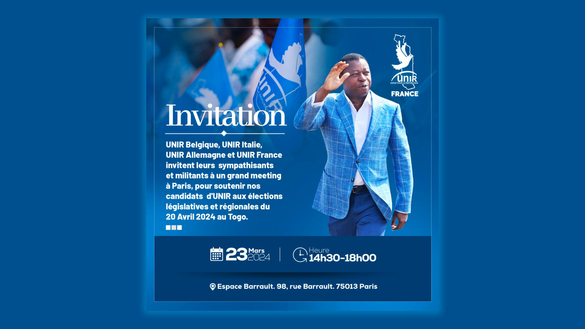©Newsoftogo-(Lomé, le 22 mars 2024)-Le Togo s’apprête à organiser les élections législatives et régionales prévues le 20 avril 2024. Dans le cadre de la mobilisation de la diaspora, la branche européenne de l’Union pour la République (UNIR) organise ce samedi 23 mars à Paris un meeting de soutien organisé par les représentations de l’UNIR en France, Belgique, Italie et Allemagne. Cette mobilisation revêt une signification particulière compte tenu de la présence significative de la diaspora togolaise dans ces pays européens.