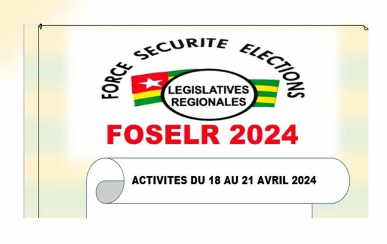 ©Newsoftogo-(Lomé, le 22 avril 2024)-La Force sécurité élections législatives et régionales (FOSELR 2024) vient de publier un deuxième bilan de ses activités de sécurisation de la campagne électorale du 18 au 21 avril 2024.